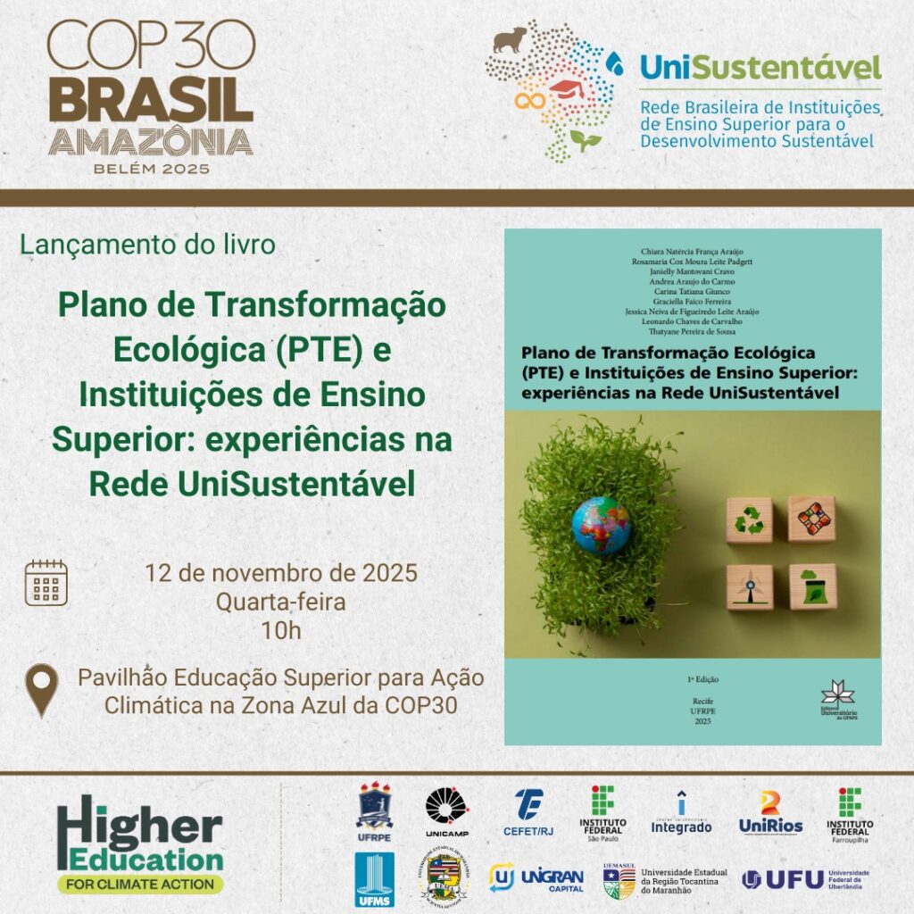 Durante a 30ª Conferência das Nações Unidas sobre Mudanças Climáticas (COP30), que será realizada em Belém, no Pará, a Rede Brasileira de Instituições de Ensino Superior para o Desenvolvimento Sustentável (Rede UniSustentável) promoverá o lançamento oficial do livro “Plano de Transformação Ecológica (PTE) e Instituições de Ensino Superior: experiências na Rede UniSustentável”.