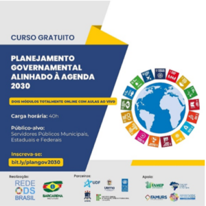 O curso “Planejamento Governamental alinhado à Agenda 2030”, promovido pela Rede ODS Brasil, foi uma iniciativa da Prefeitura de Barcarena/PA, realizado em parceria com o Centro Universitário do Distrito Federal – UDF; o Instituto Federal de Educação, Ciência e Tecnologia Farroupilha – IFFar; a Universidade Estadual do Maranhão – UEMA; a Universidade Federal Rural de Pernambuco – UFRPE e o Programa das Nações Unidas para o Desenvolvimento – PNUD, tendo o apoio da Associação Brasileira de Municípios – ABM; Federação das Associações de Municípios do Estado do Pará – FAMEP e da Federação das Associações de Municípios do Estado do Rio Grande do Sul – FAMURS.